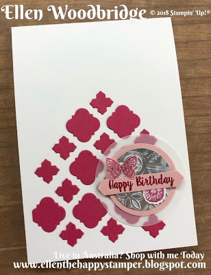 Ellen Woodbridge Independent Stampin’ Up!® Demonstrator – Central Coast NSW Australia: Stampin Up! Florentine Thinlits and Piece of Cake and Tin Tile Embossing Folder Birthday Card